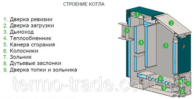 Структура теплообмінника цього котла виготовлена так, щоб вино, що виділяється, максимально передавалося на теплоносій системи опалення.