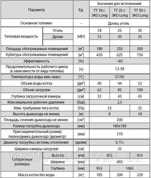 Технічні характеристики твердопаливного котла ProTech (Протеч) ЕКО Long: